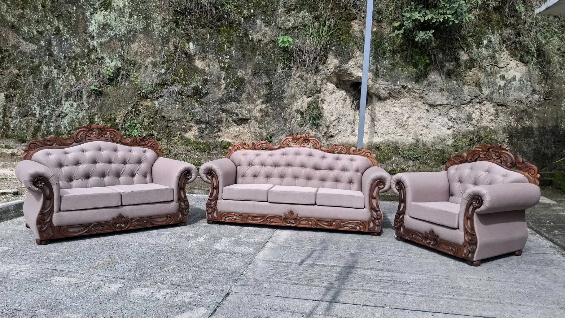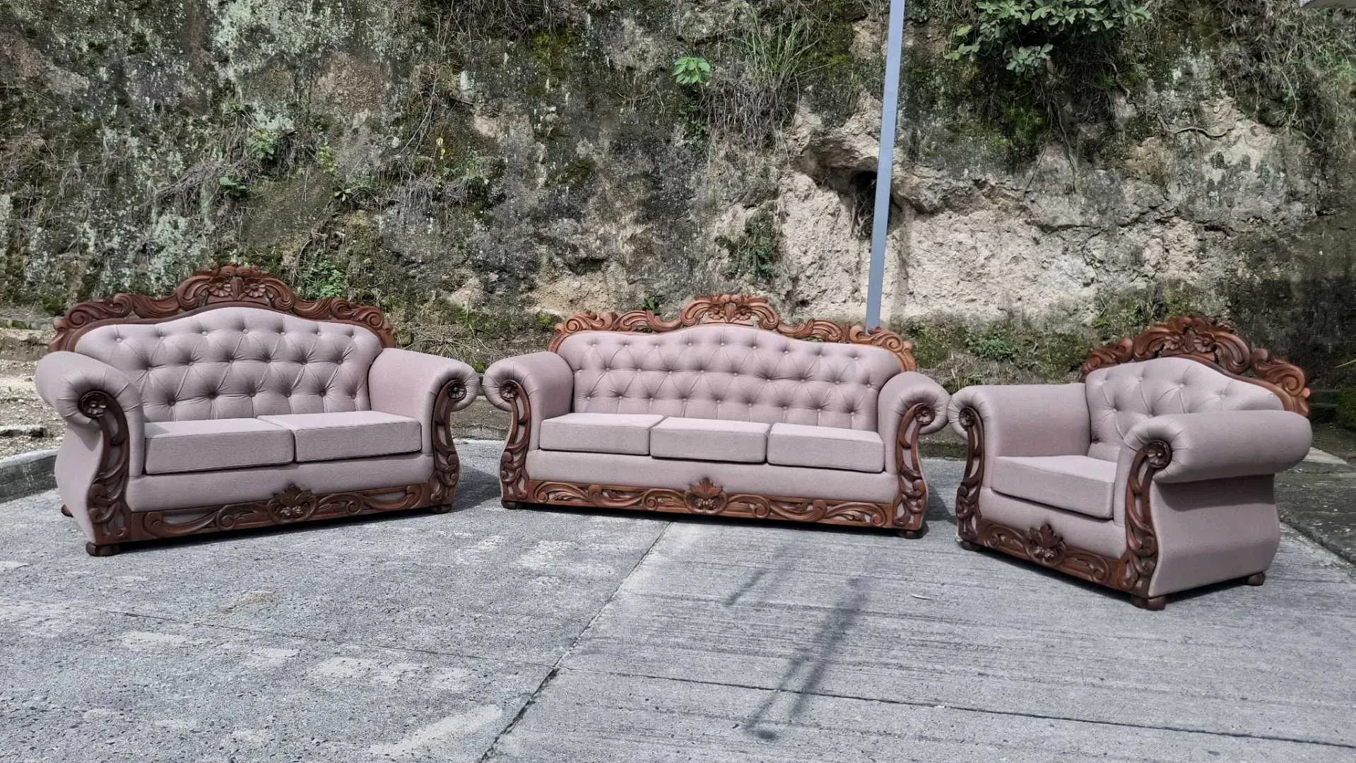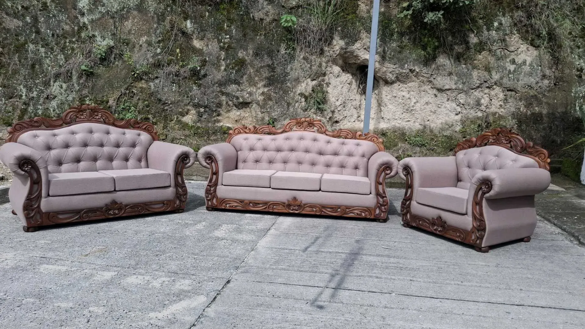 Presenta un diseño distintivo con marcos de madera tallada en tonos oscuros, que evocan un estilo clásico como el Luis XV o barroco. Los detalles ornamentados en los reposabrazos y la base añaden un aire de sofisticaciónPresenta un diseño distintivo con marcos de madera tallada en tonos oscuros, que...