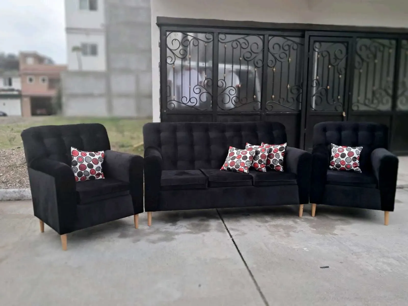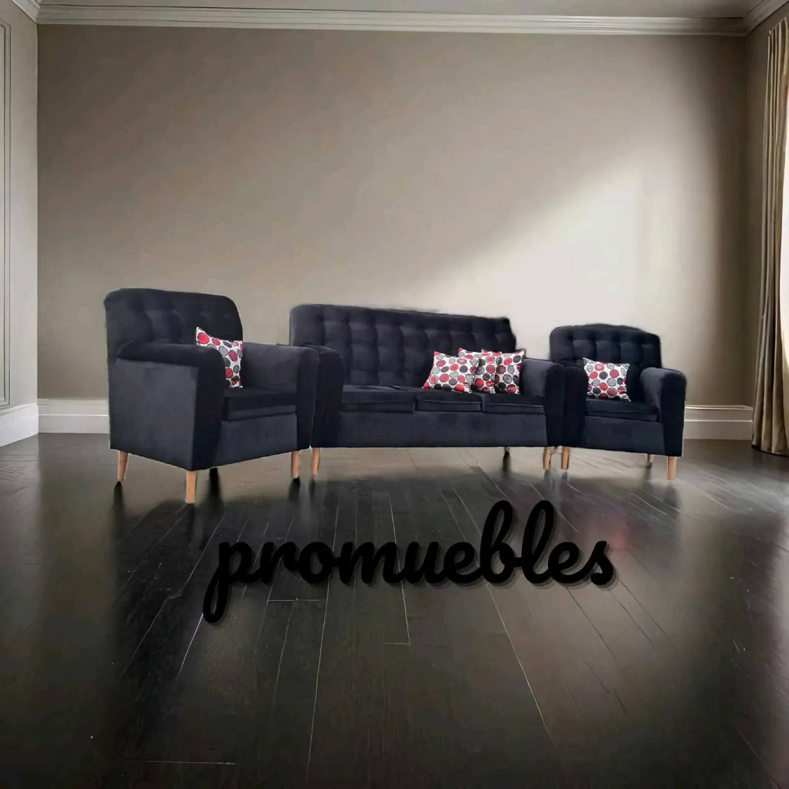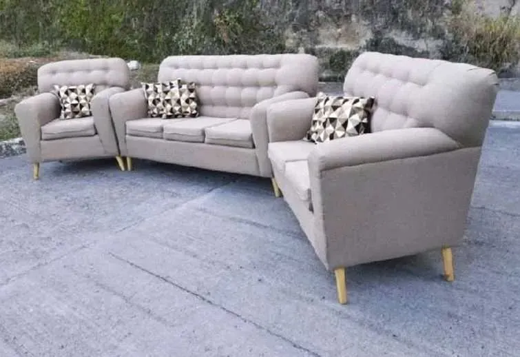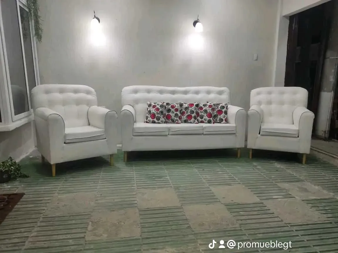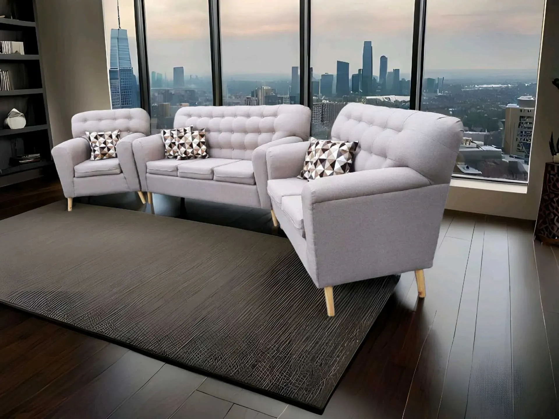 juego de sala de tres piezas, compuesto por un sofá de tres plazas y dos sillones individuales, tapizados en una tela de color beige claro. Los muebles presentan un diseño con capitoné en los respaldos y patas de madera clara, y se complementan con cojines decorativos de patrón geométrico en tonos o...