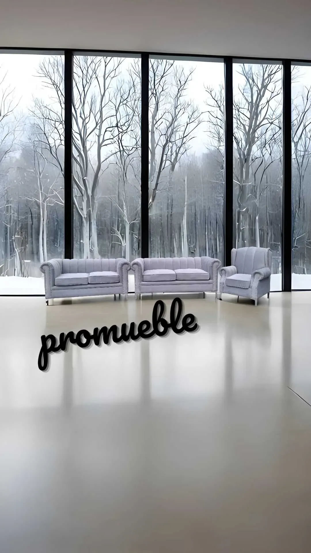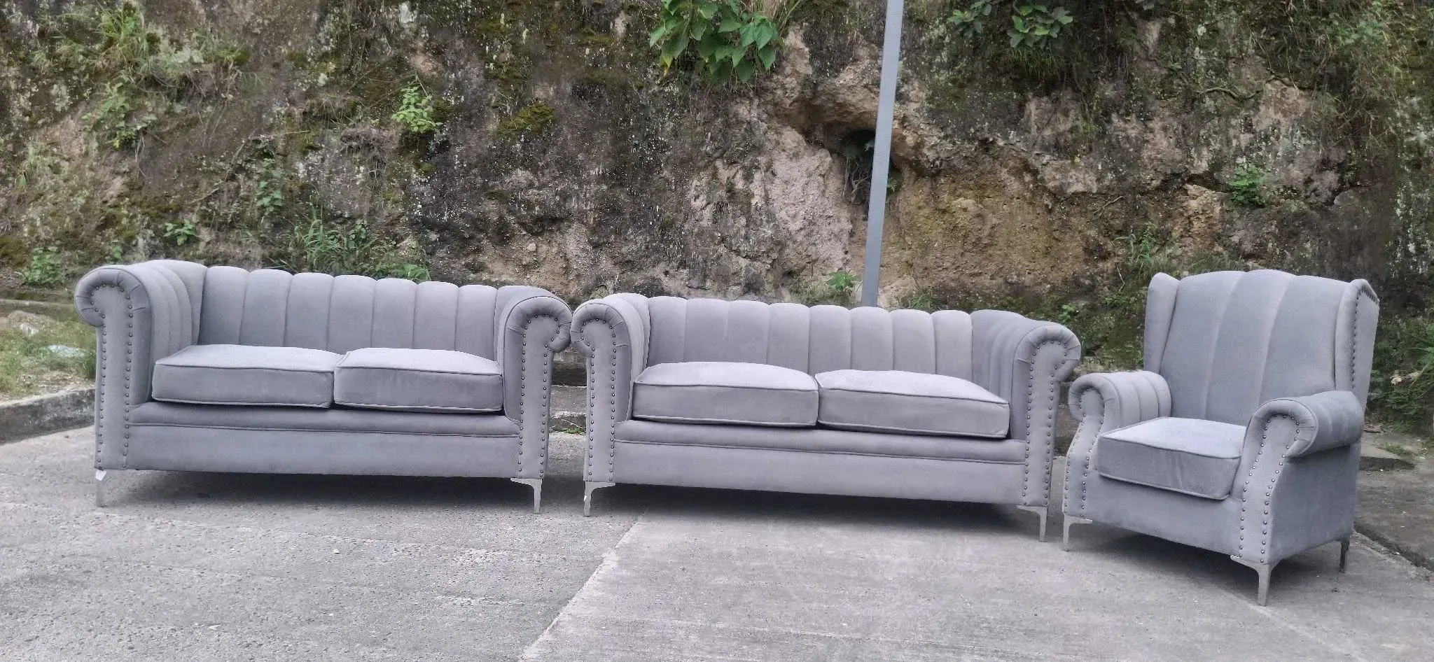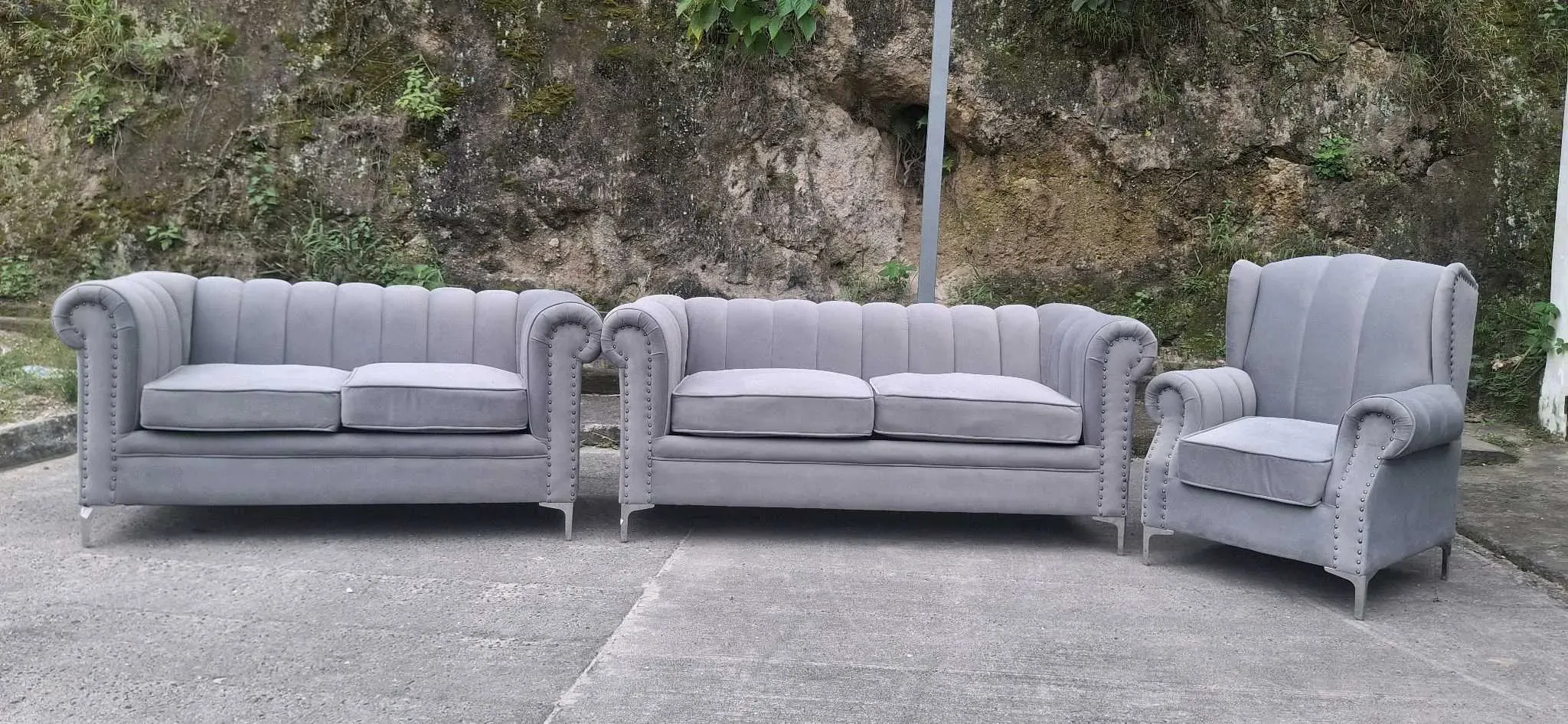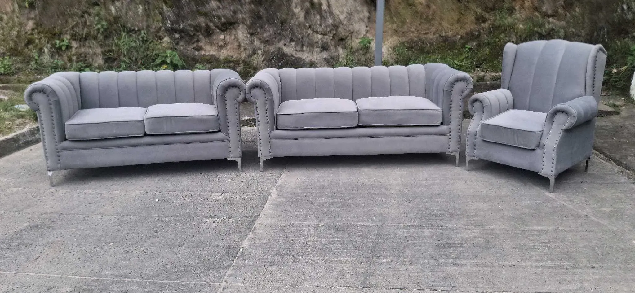 La imagen muestra un conjunto de tres muebles tapizados de color gris, que consta de dos sofás de dos plazas y un sillón individual. Los muebles tienen un diseño clásico con respaldos acanalados y detalles de tachuelas en los brazos. Están colocados al aire libre sobre un suelo de cemento, con una p...